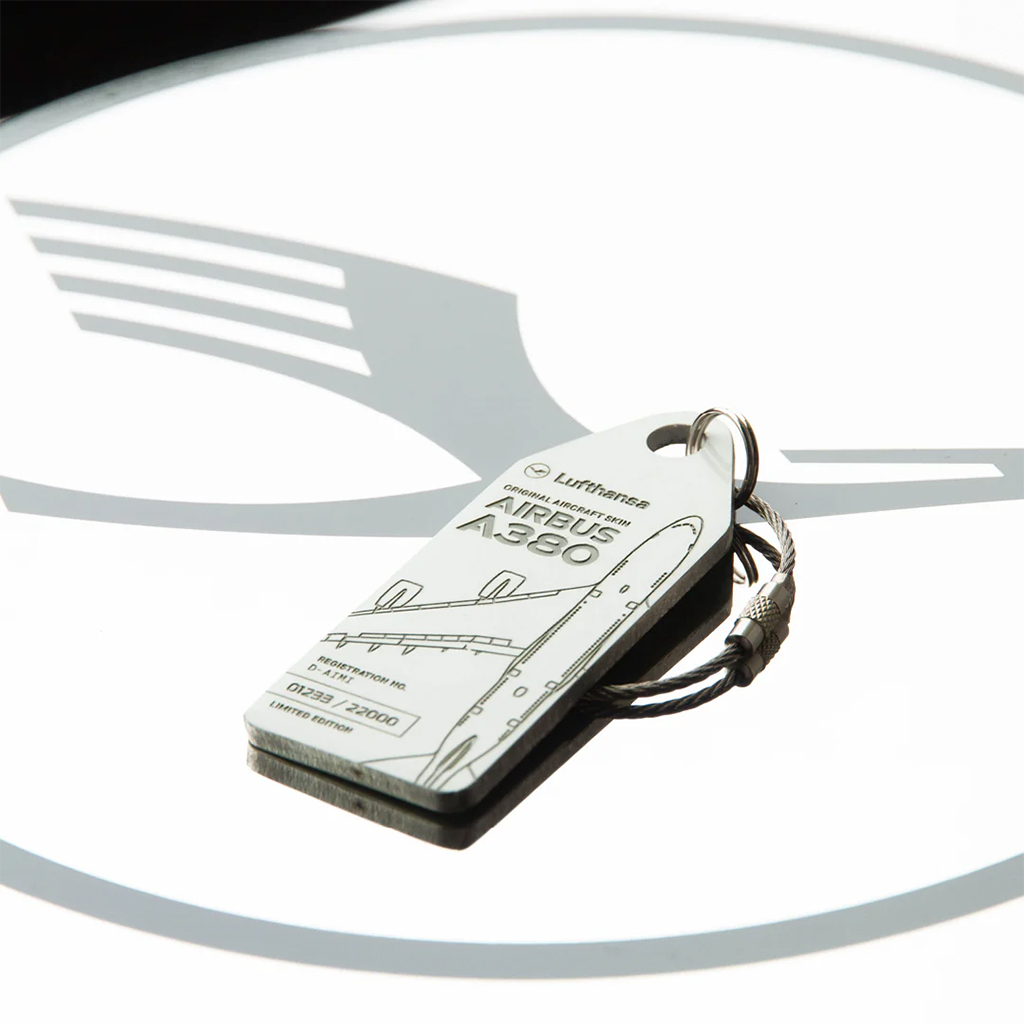 Der Lufthansa Aviationtag besteht aus dem originalen Aluminium des Airbus A380 mit der Registrierung D-AIMI.